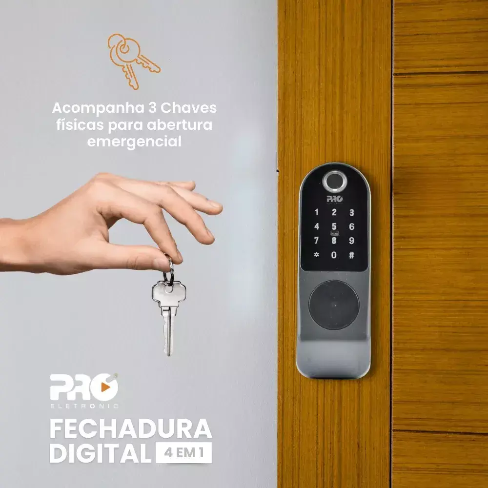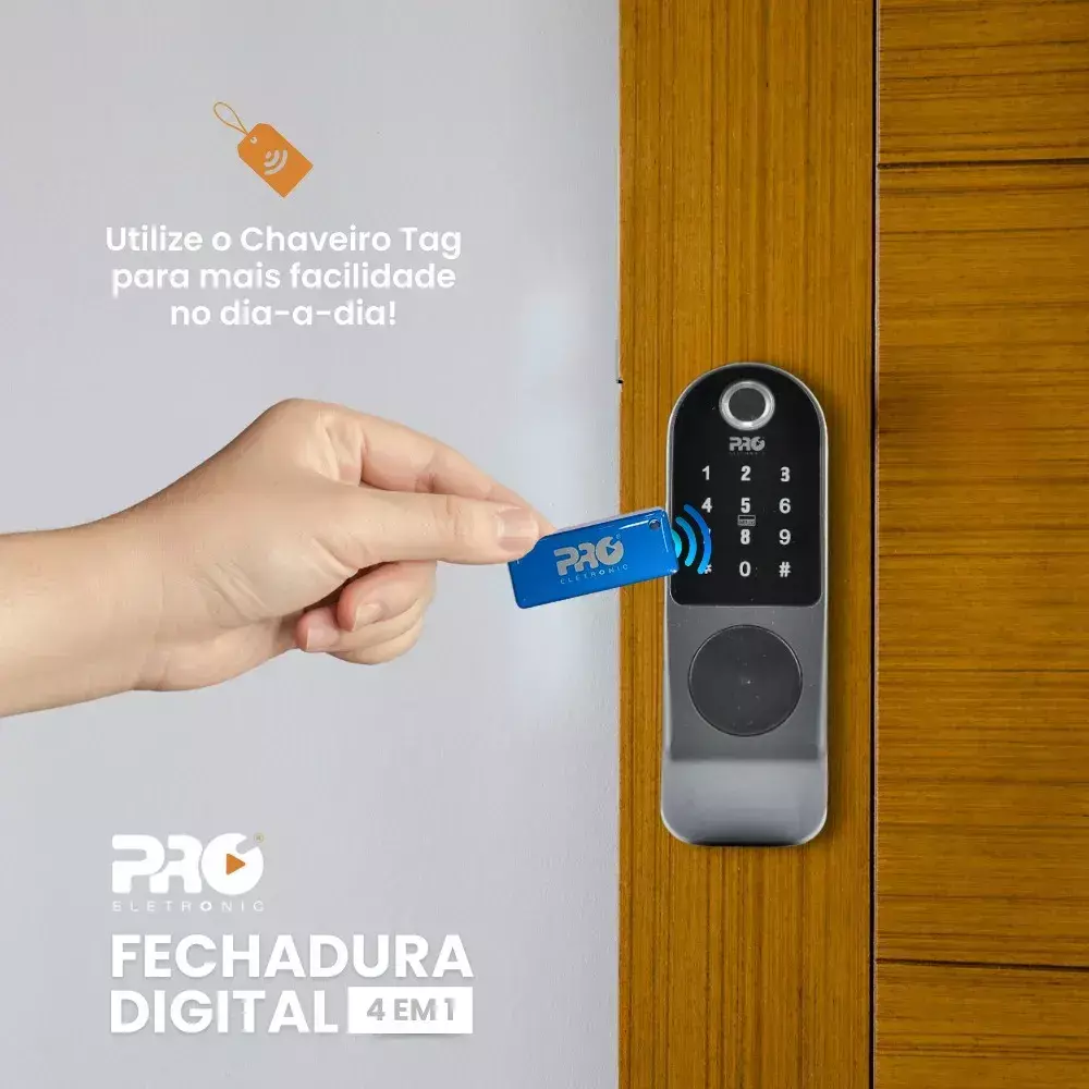 A fechadura digital biométrica sobrepor 4 em 1 + Tag + Chave PROFD-2000 Proeletronic é uma fechadura eletrônica projetada para uso em portas de entrada de residências, escritórios e outras instalações. Possui quatro métodos de desbloqueio: impressão digital, cartão RFID, senha numérica e chave mecânica.